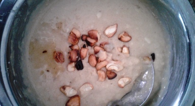 Incorporate cardamom and cumin seeds powder, along with roasted cashew nuts and ghee.