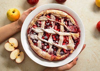 - You can either place the whole top crust over the apples and cut slits for venting, or create a lattice pattern by cutting the crust into strips and weaving them together.